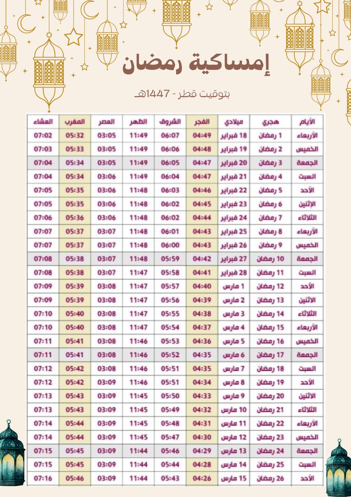 وتختلف مواعيد الإمساك والإفطار من مدينة إلى أخرى حسب الموقع الجغرافي وخطوط الطول والعرض.لذلك تنقل لكم على منصة أفدني التعليمية امساكية شهر رمضان المبارك لعام 1447 هجريًا في دولة قطر