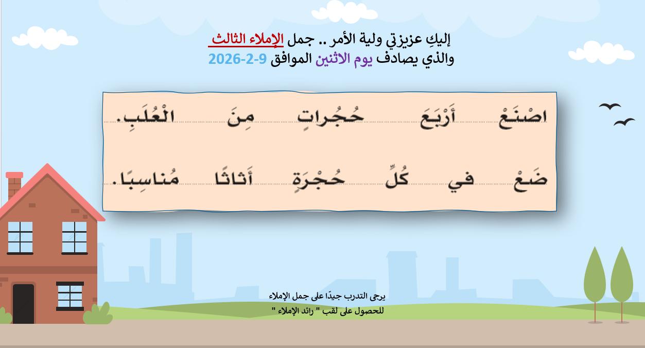 تُعد جمل الإملاء من أهم الوسائل التعليمية التي تساعد الطالب في هذه المرحلة على تعلّم الكتابة الصحيحة، وتنمية مهارة التهجئة، وربط الحرف بالكلمة داخل جملة مفهومة وبسيطة.