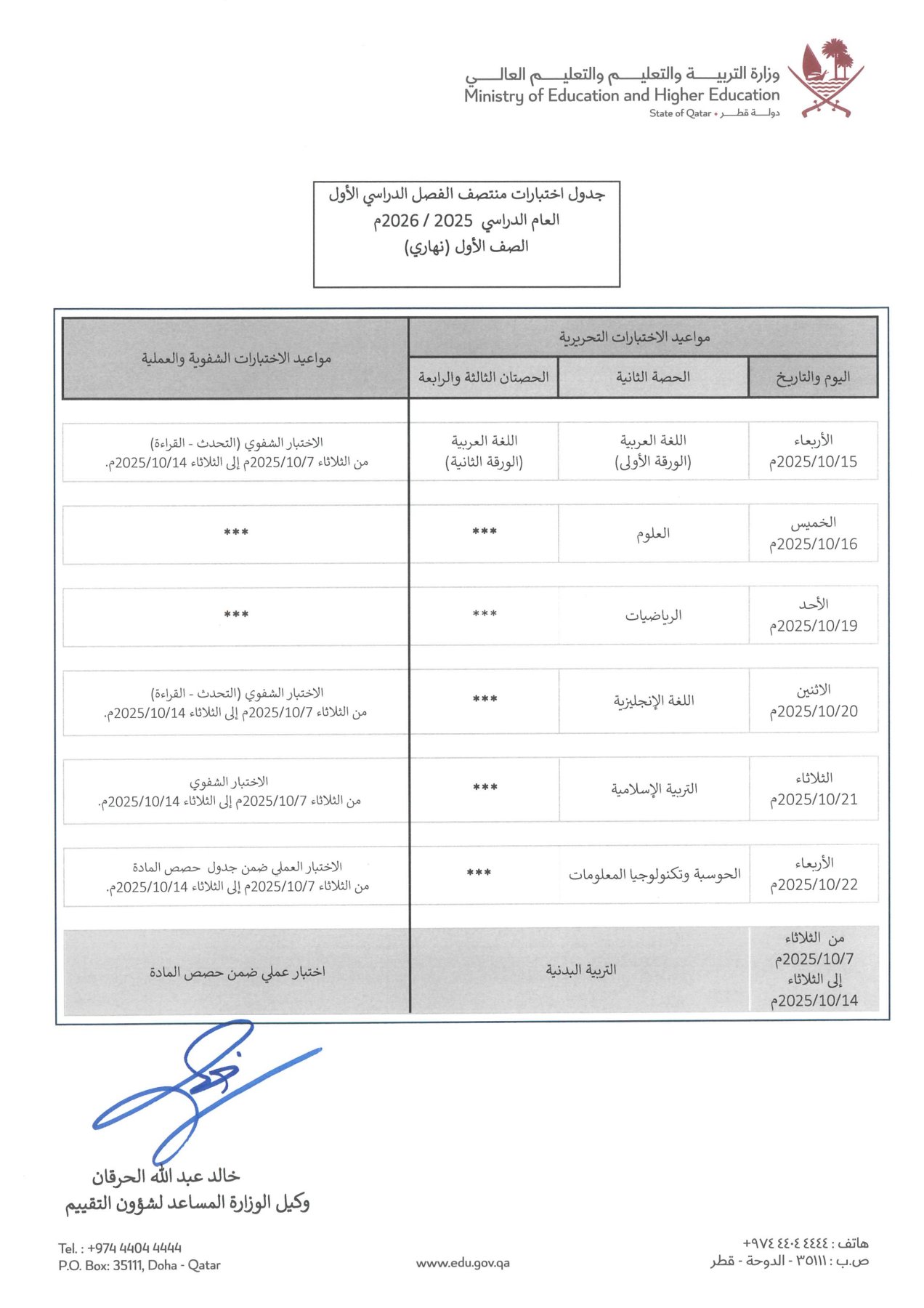 جدول اختبارات الخاص بمواد المستوى الأول منتصف الفصل الأول بدولة قطر: