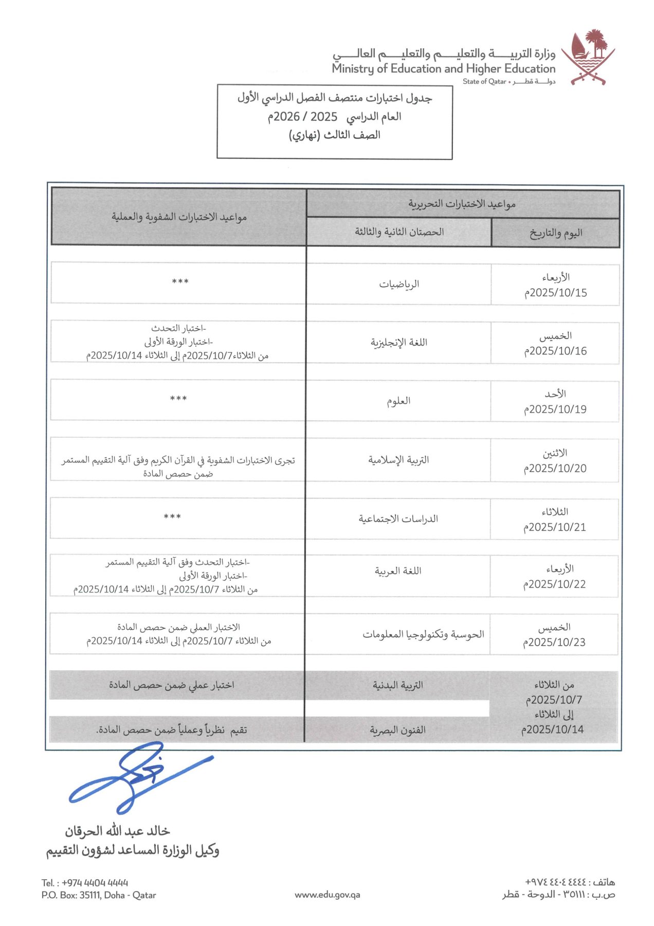 جدول اختبارات الخاص بمواد المستوى الثالث منتصف الفصل الأول بدولة قطر: