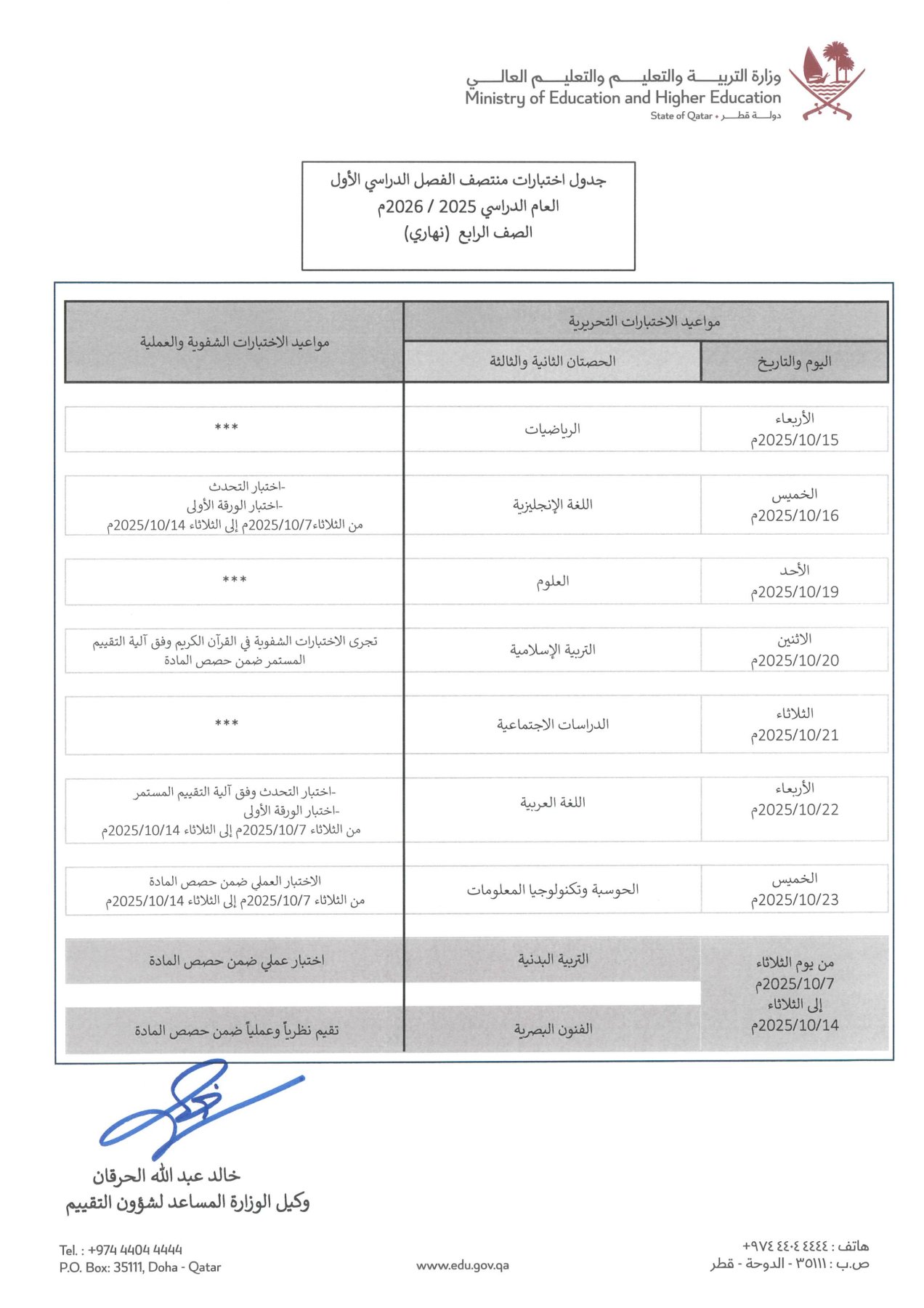 جدول اختبارات الخاص بمواد المستوى الرابع منتصف الفصل الأول بدولة قطر: