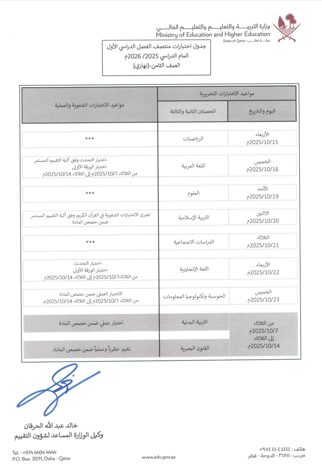 جدول اختبارات الخاص بمواد المستوى الثامن منتصف الفصل الأول بدولة قطر: