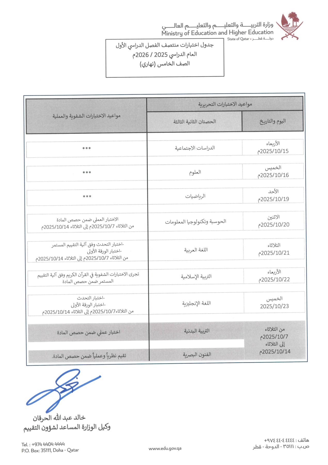 جدول اختبارات الخاص بمواد المستوى الخامس منتصف الفصل الأول بدولة قطر: