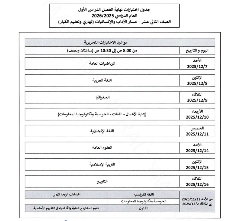 جدول اختبارات المستوى الثاني عشر أدبي لنهاية الفصل الأول