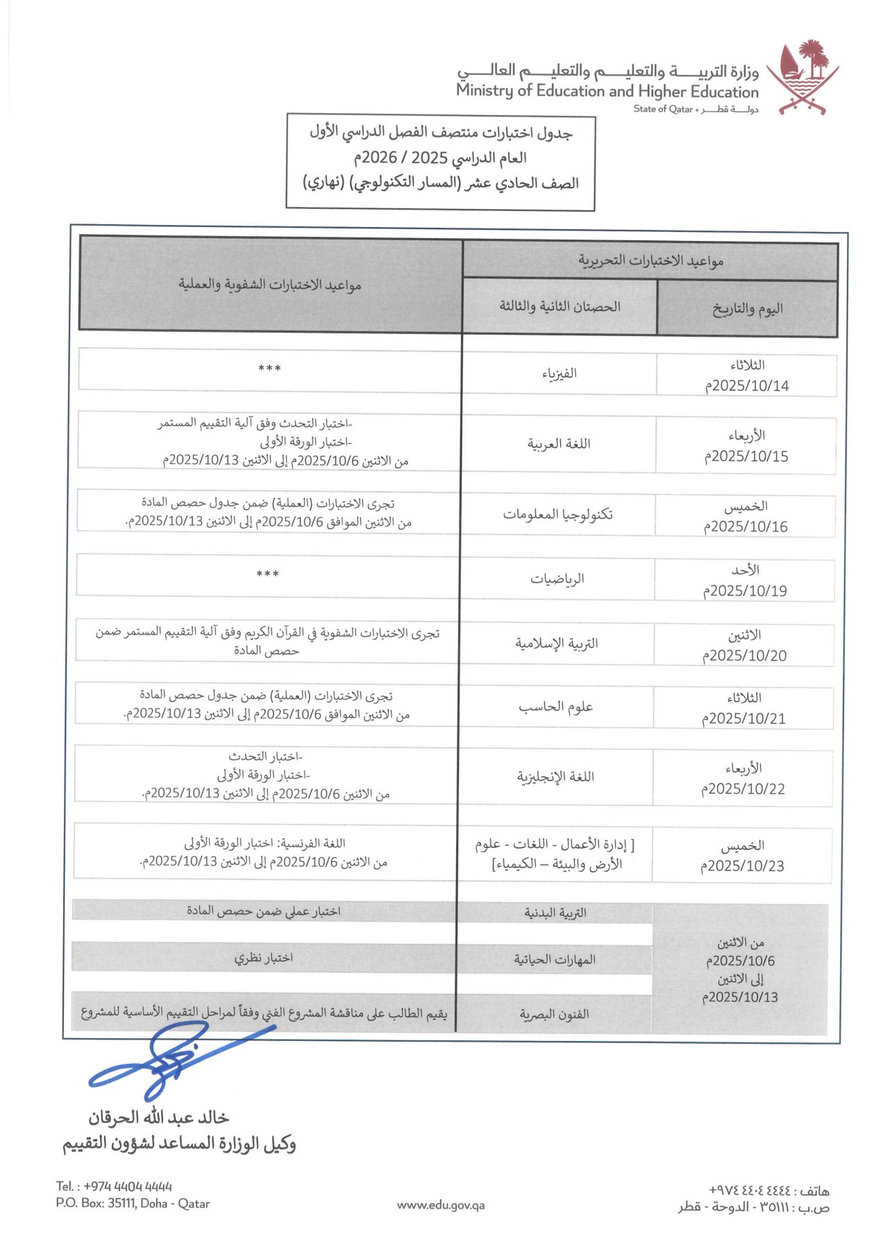 جدول اختبارات الخاص بمواد المستوى الحادي عشر تكنولوجي منتصف الفصل الأول بدولة قطر: