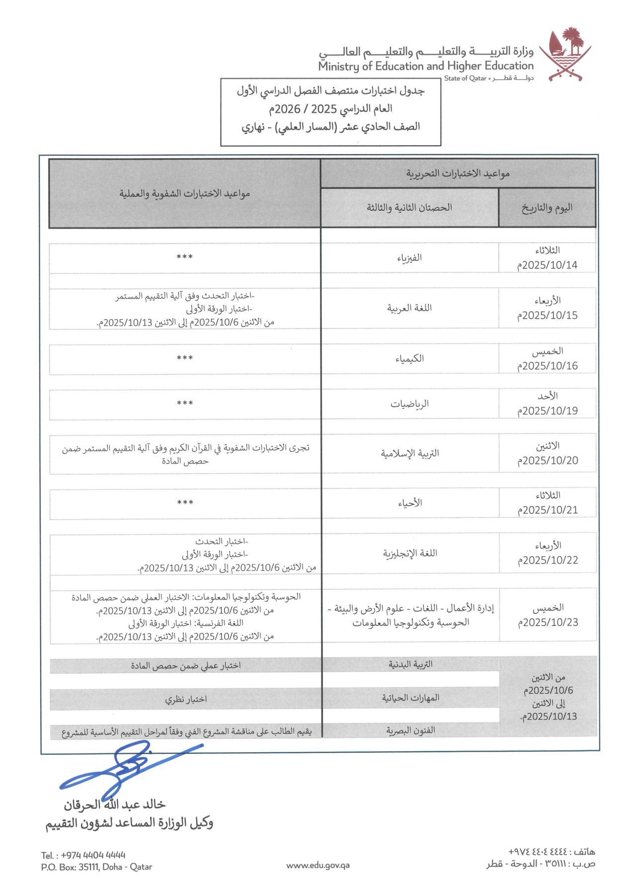 جدول اختبارات الخاص بمواد المستوى الحادي عشر علمي منتصف الفصل الأول بدولة قطر: