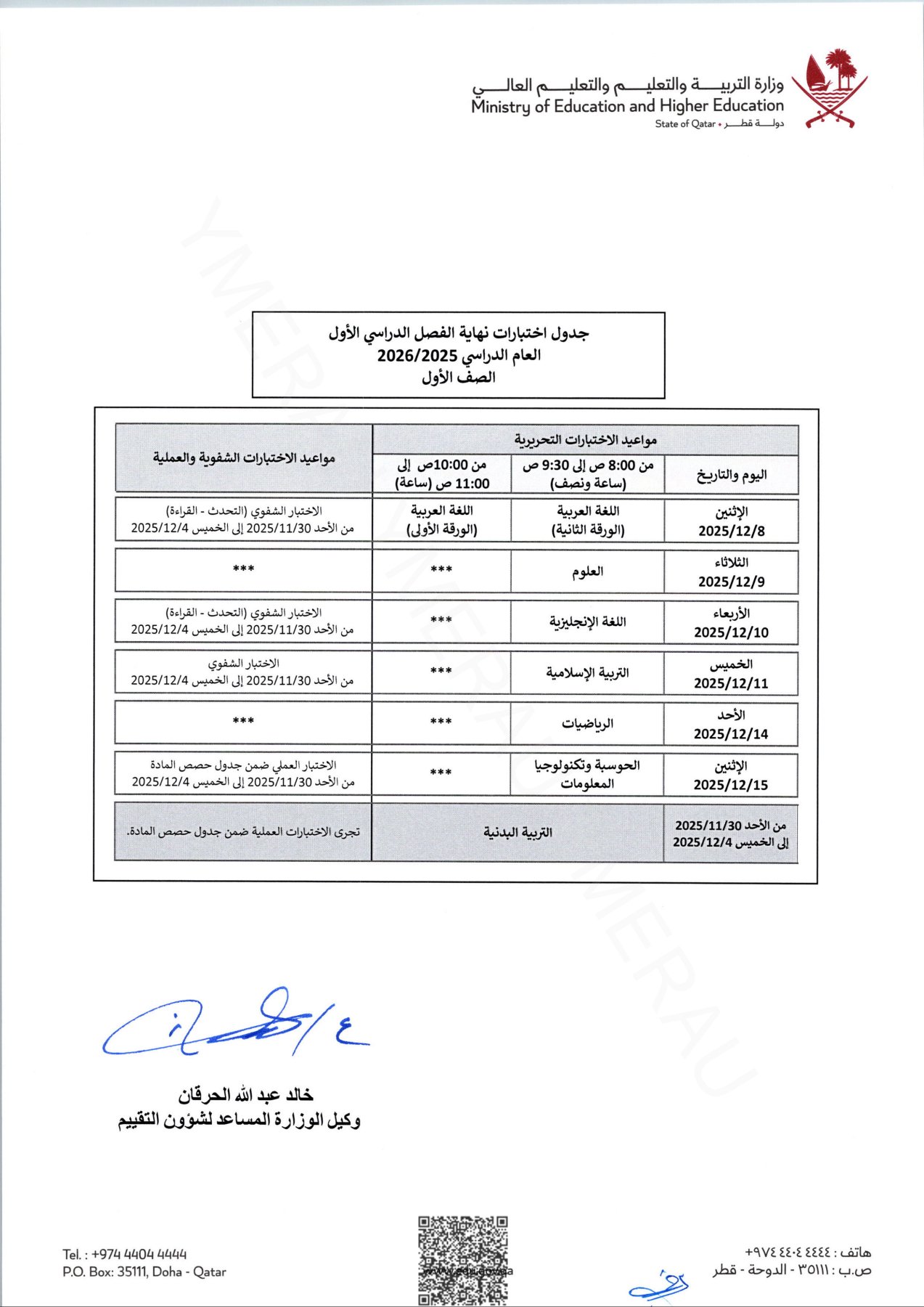 جدول اختبارات نهاية الفصل الأول المستوى الأول في قطر: