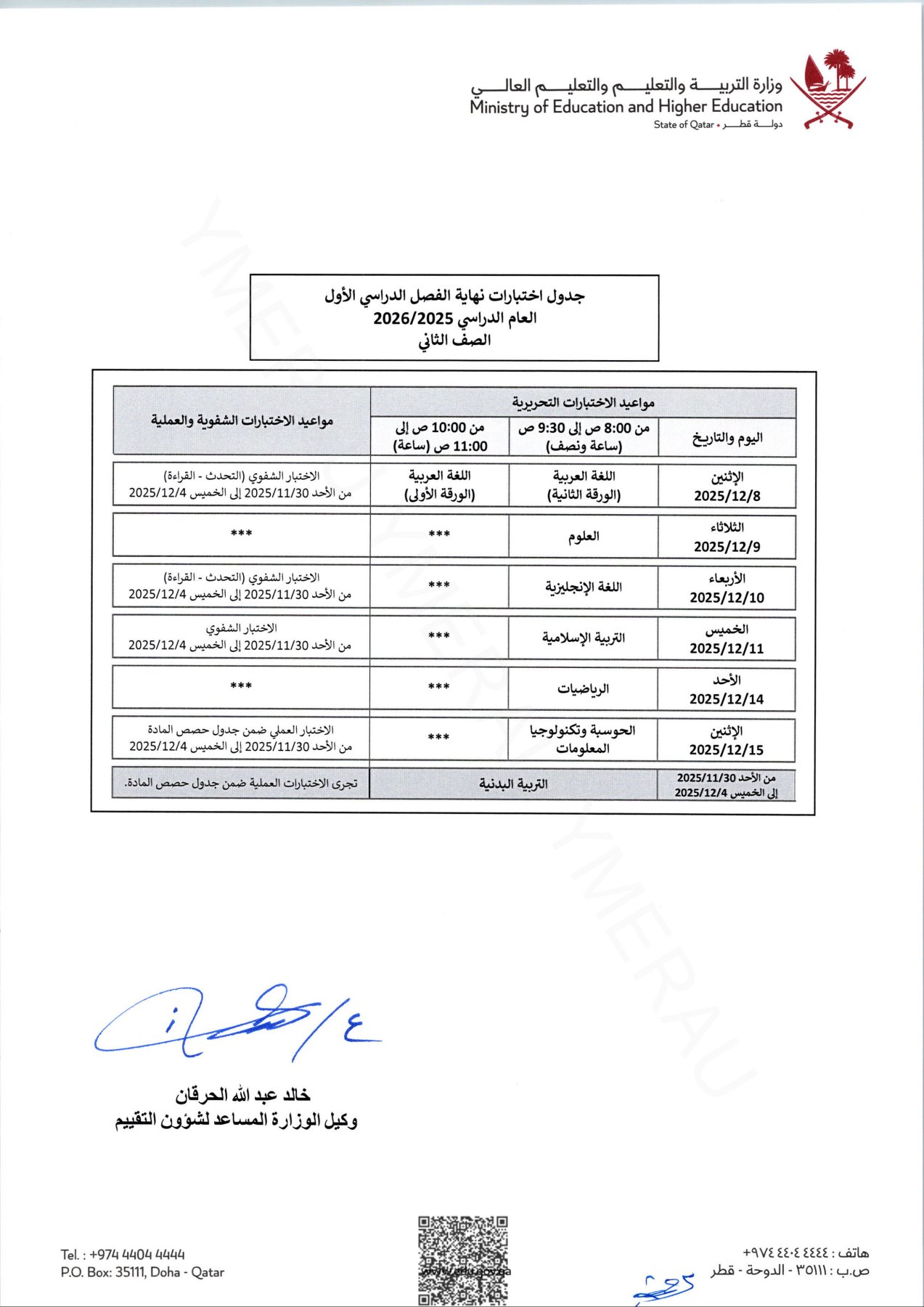جدول اختبارات نهاية الفصل الأول المستوى الثاني في قطر: