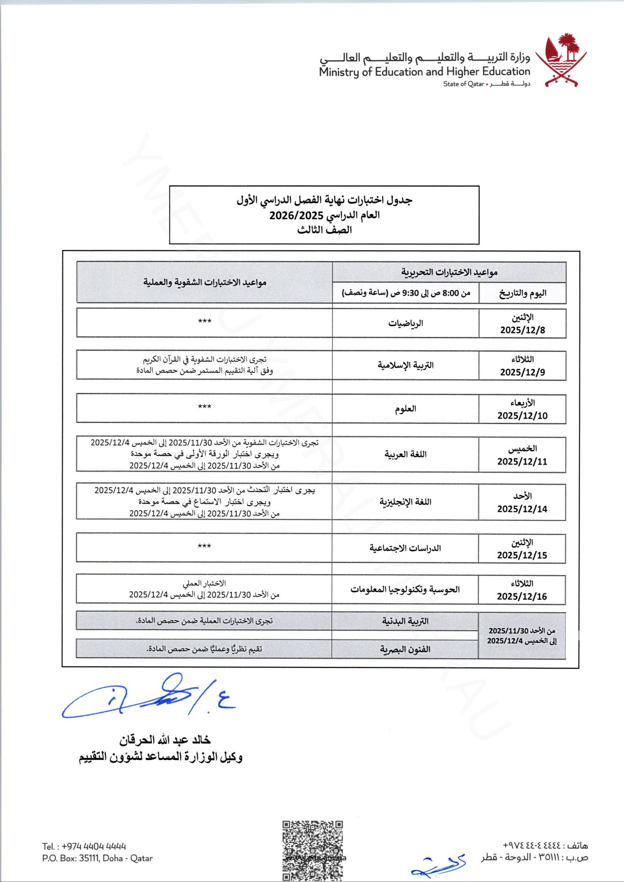 جدول اختبارات نهاية الفصل الأول المستوى الثالث في قطر: