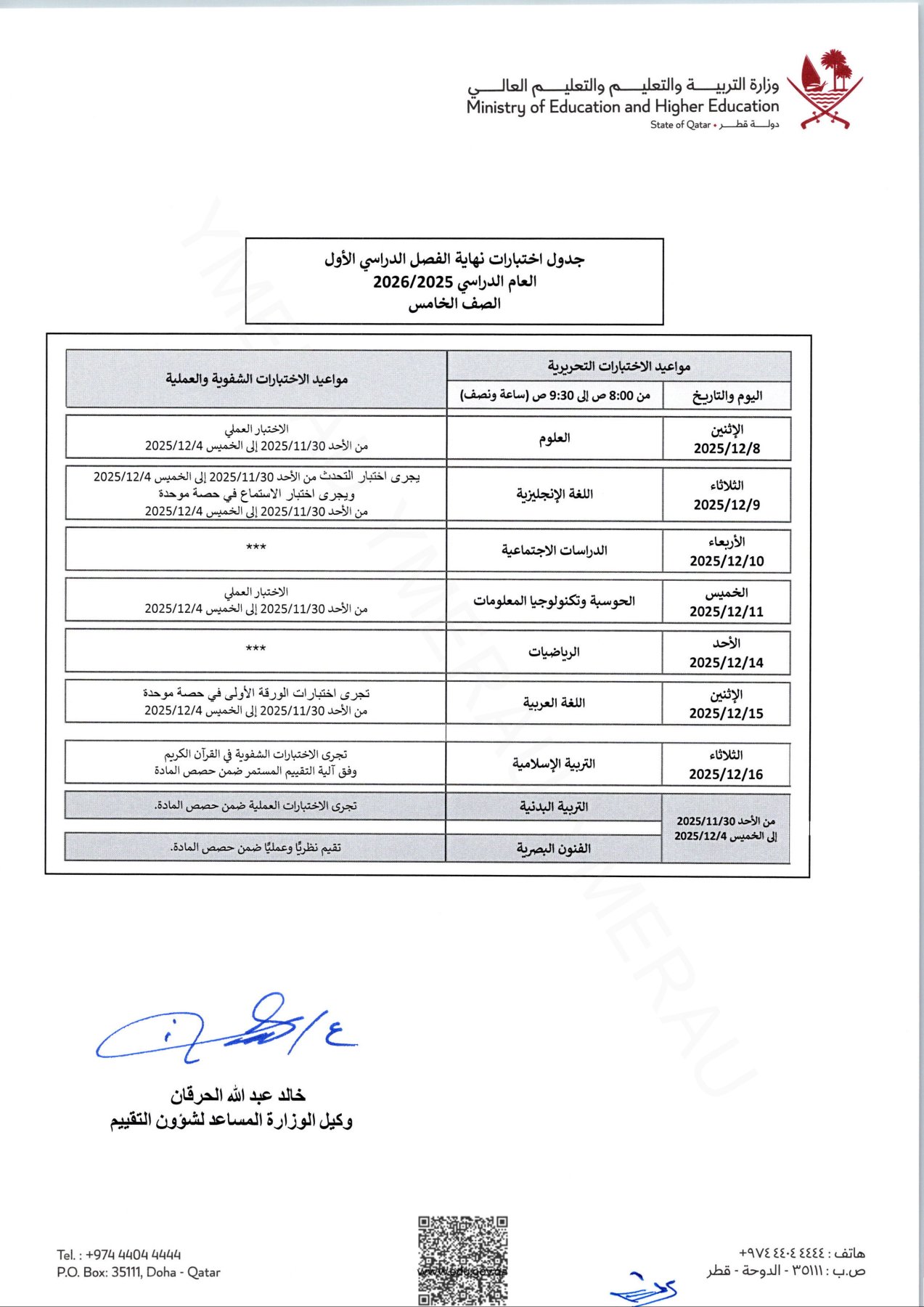 جدول اختبارات نهاية الفصل الأول المستوى الخامس في قطر: