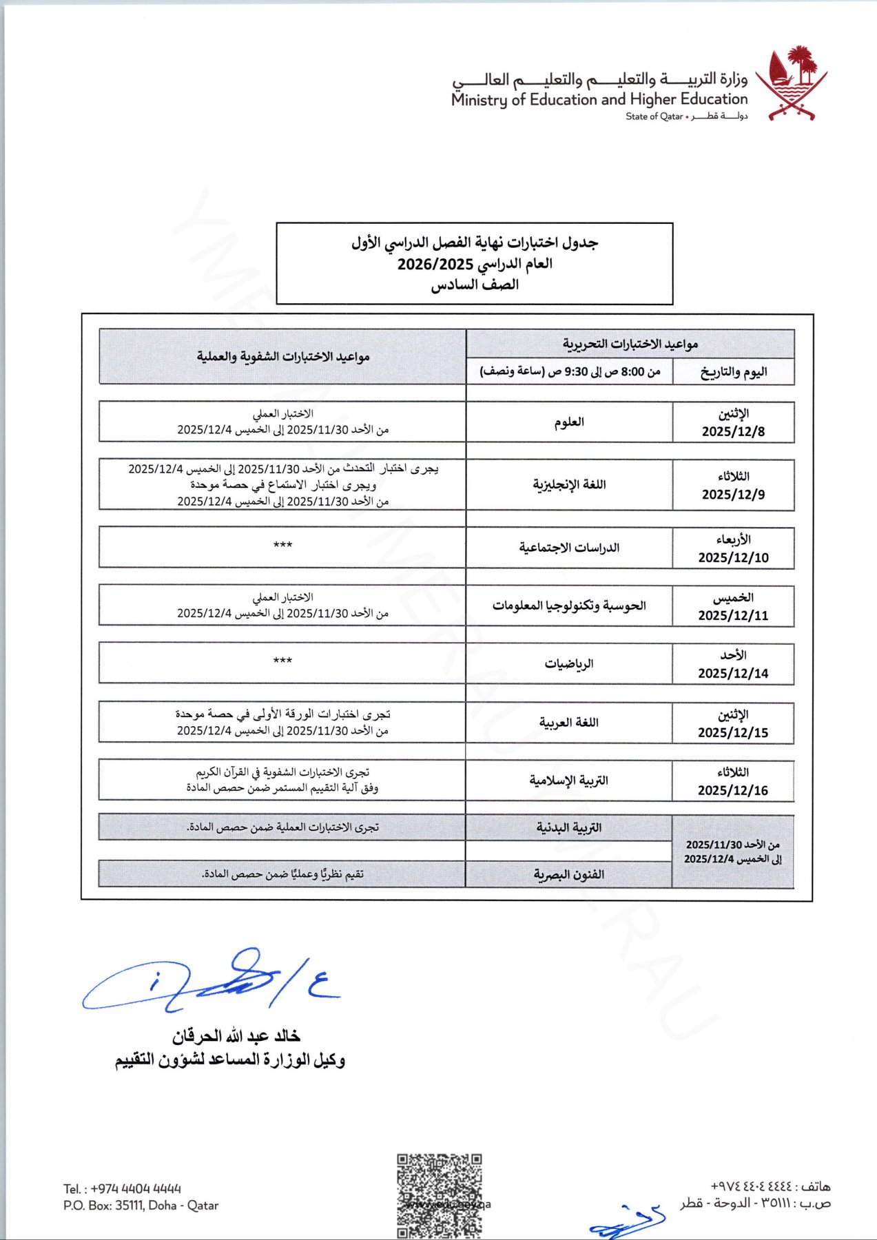 جدول اختبارات نهاية الفصل الأول المستوى السادس في قطر: